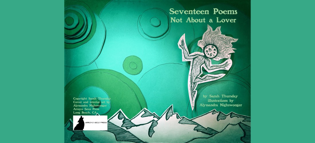 Seventeen Poems Not About a Lover, by founder of Sadie Girl Press, Sarah Thursday, published by Arroyo Seco Press is a 38 page, perfect-bound chapbook. It includes paper-cut illustrations for each poem by Alyssandra Nighswonger. Available through Sadie Girl Press Bookstore.